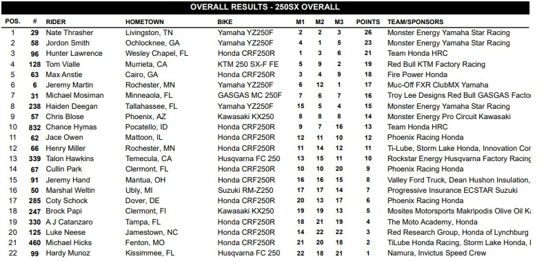 A pesar de no haber sido quien haya visto la bandera a cuadros primero en ninguna de las carreras, Nate Thrasher se quedó con la victoria en la 250 Este haciendo gala de su regularidad, con dos segundos puestos en las primeras dos finales y con una tercera colocación en la última carrera.