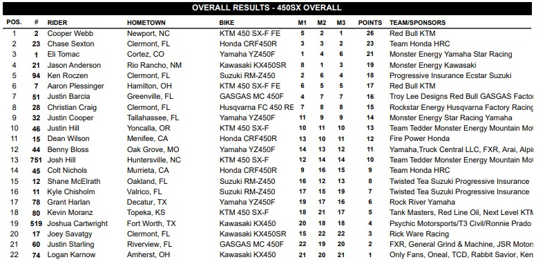 El podio lo completaron Jordon Smith, vencedor de la segunda final, y Hunter Lawrence, aún líder del campeonato y el ganador del primer main. La última carrera quedó en manos del legendario Jeremy Martin, quien culminó sexto en la general.